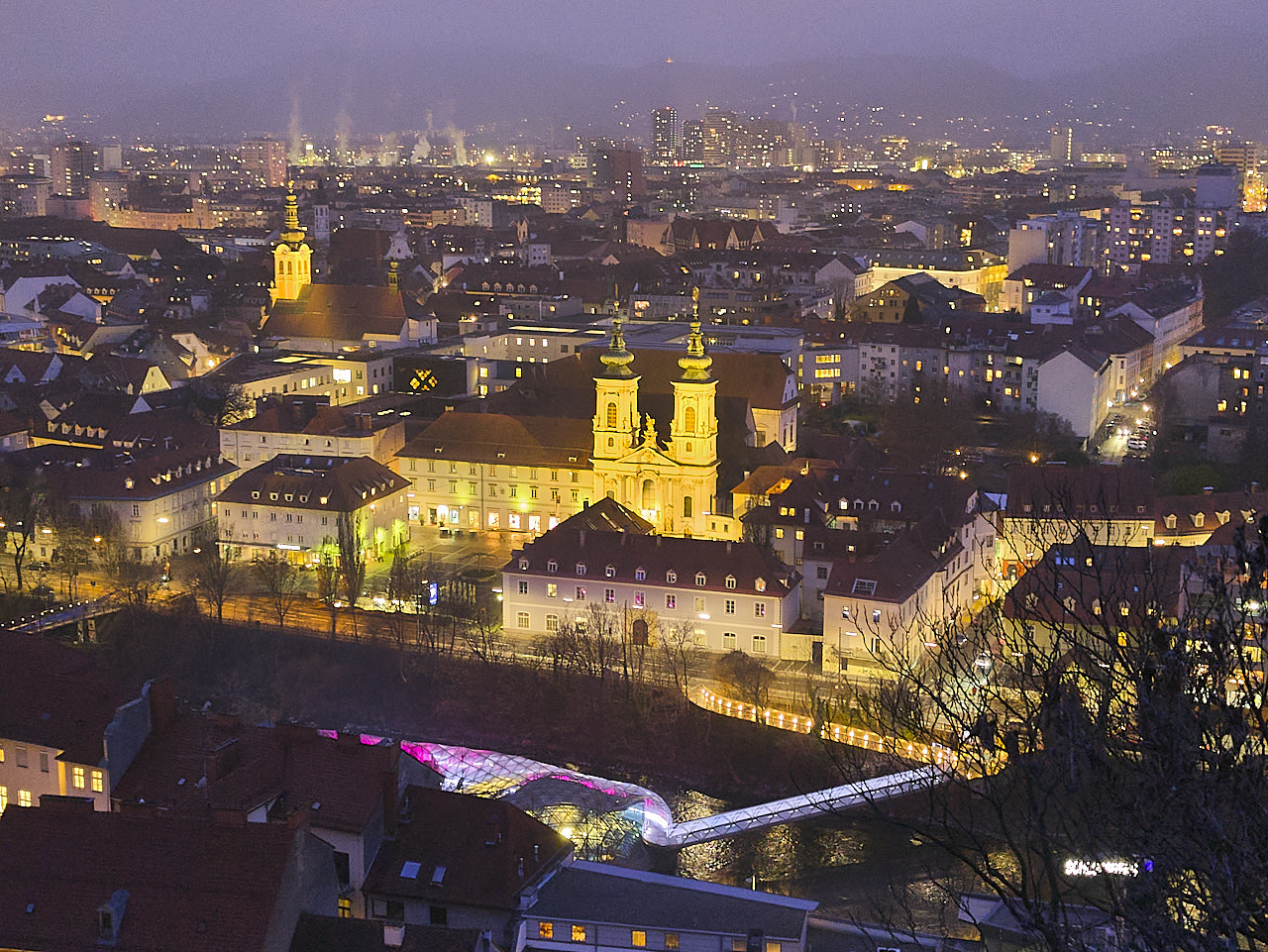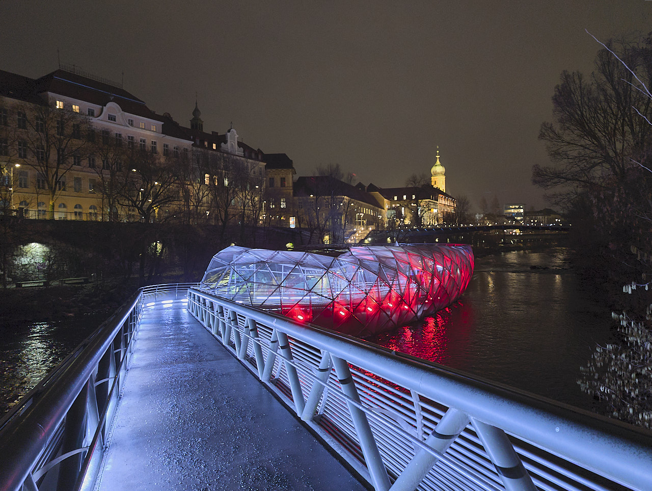 Am dritten Tag wollten wir Graz im Abendlicht erleben. Also ging es nochmals auf den Schlossberg, diesmal zu Fuss – zur Ertüchtigung, wie wir uns einredeten. Und es lohnte sich. Die Stadt erstrahlte in allen Farben, und besonders die Murinsel zog mit ihrem Lichterspiel die Blicke auf sich. Diese künstliche, schwimmende Plattform aus Stahl und Glas, entworfen vom New Yorker Künstler Vito Acconci, verbindet Kunst, Architektur und Flussraum auf faszinierende Weise.
