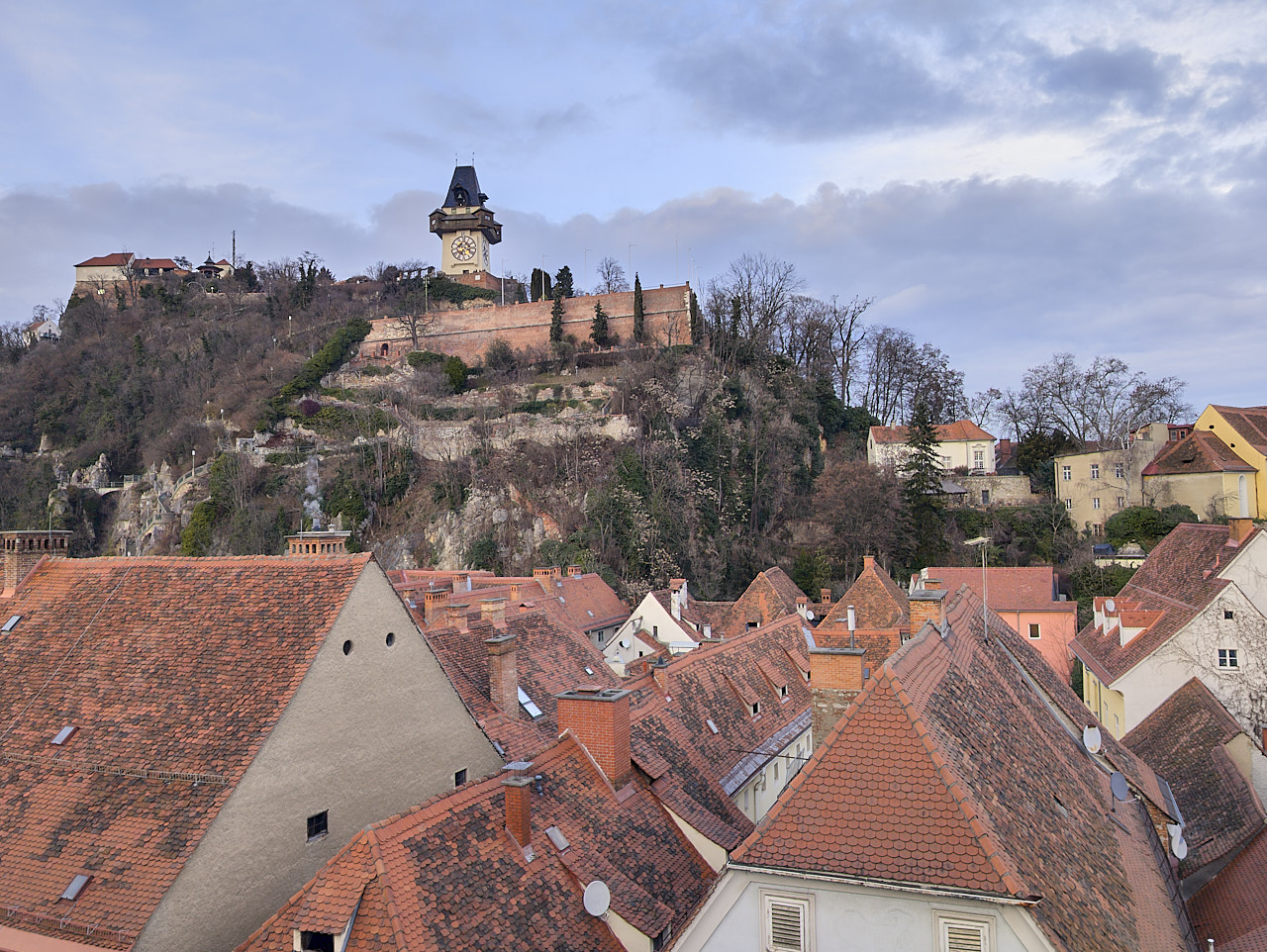 Natürlich besuchten wir auch den Schlossberg. Der 473 Meter hohe Hügel mitten in der Stadt, einst Festung, heute Parkanlage mit dem berühmten Uhrturm, bietet einen Blick über die gesamte Altstadt mit ihren roten Dächern, die Mur und die umliegenden Hügel der Steiermark. Man kann hinauflaufen, die Standseilbahn nehmen oder den Glaslift. Da wir bereits einige Schritte in den Beinen hatten, entschieden wir uns für Letzteren. Gleich daneben führt eine lange Rutschbahn mit vielen Wenden hinunter. Obwohl keine Rutschbahn dieser Welt vor mir sicher ist – selbst in meinem fortgeschrittenen Alter – entschied ich mich schweren Herzens dagegen. Nicht aus Vernunft, sondern aus Angst, dass mir übel werden könnte.