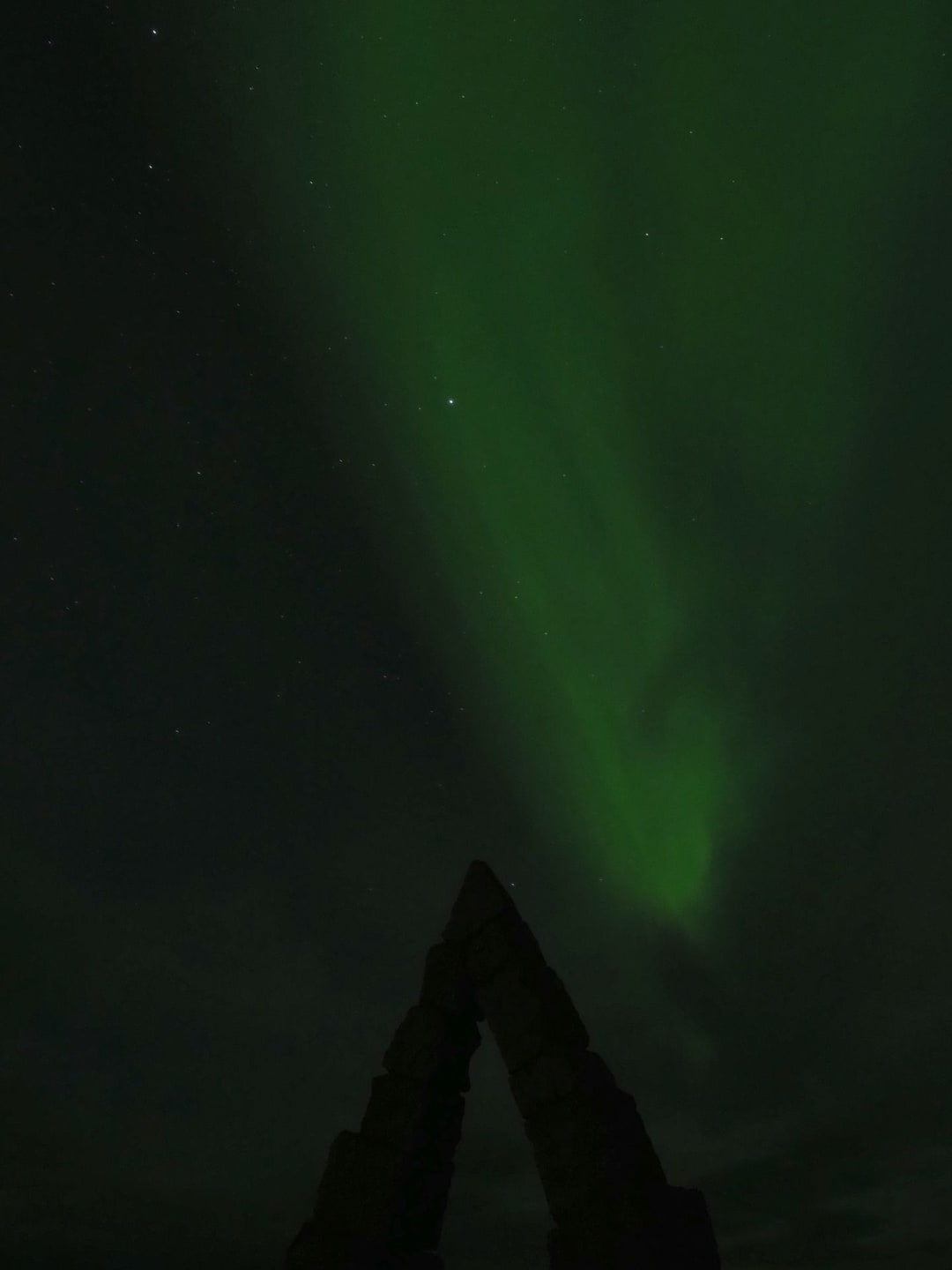 An einem klaren Abend entscheiden wir uns, mal zu schauen, ob es bereits Nordlichter am Nachthimmel gibt. Von der Jahreszeit her, wäre es langsam möglich gewesen. Die Chancen sind aber sehr gering, auch weil der Vollmond kurz bevorsteht und der Himmel nicht total verdunkelt ist. Wir gehen zum «Arctic-Henge» - ein gutes Fotosujet und spannendes Steinmonument - dessen Bau im Jahre 2005 begann und bis heute noch nicht fertig gestellt wurde. Wir sind bis kurz nach Mitternacht dort – ganz alleine – in der Dunkelheit mit Mondschein. Die absolute Stille und die kühle Luft sind herrlich und der Mond sorgt für eine mystische Stimmung. Kurz vor Mitternacht flackert es am Himmel, wir sehen ein Nordlicht, es ist klein, aber es ist ein Nordlicht.