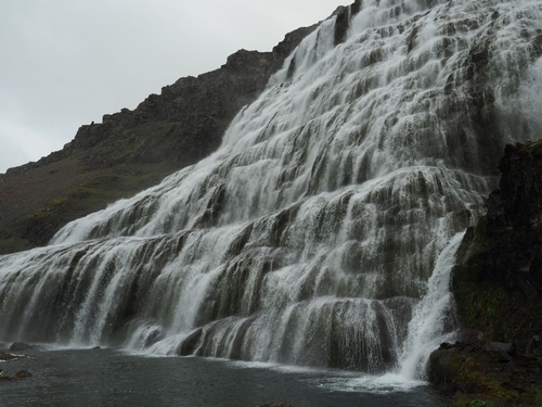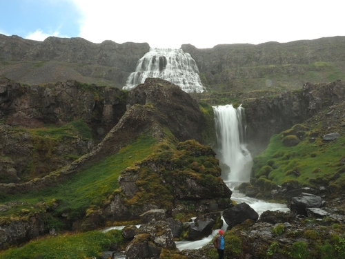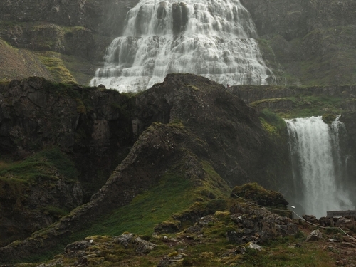 Der Dynjandi-Wasserfall, der höchste Wasserfall im Gebiet der Westfjorde, liegt im Arnarfjörður direkt an der Strasse Nr. 60. Er stürzt sich von der Hochfläche Dynjandisheiði über zahllose Stufen rund 100m in die Tiefe und wird dabei immer breiter. Deshalb wird er auch oft als Brautschleier-Wasserfall bezeichnet.